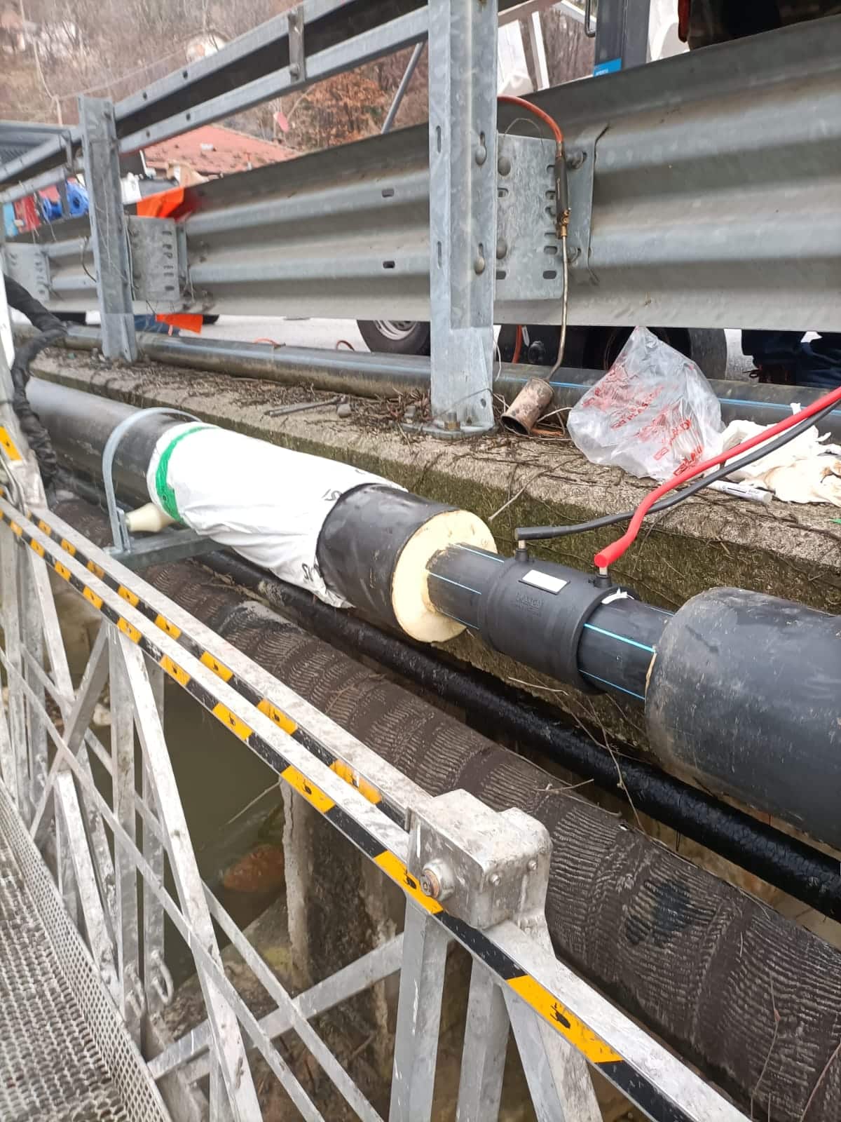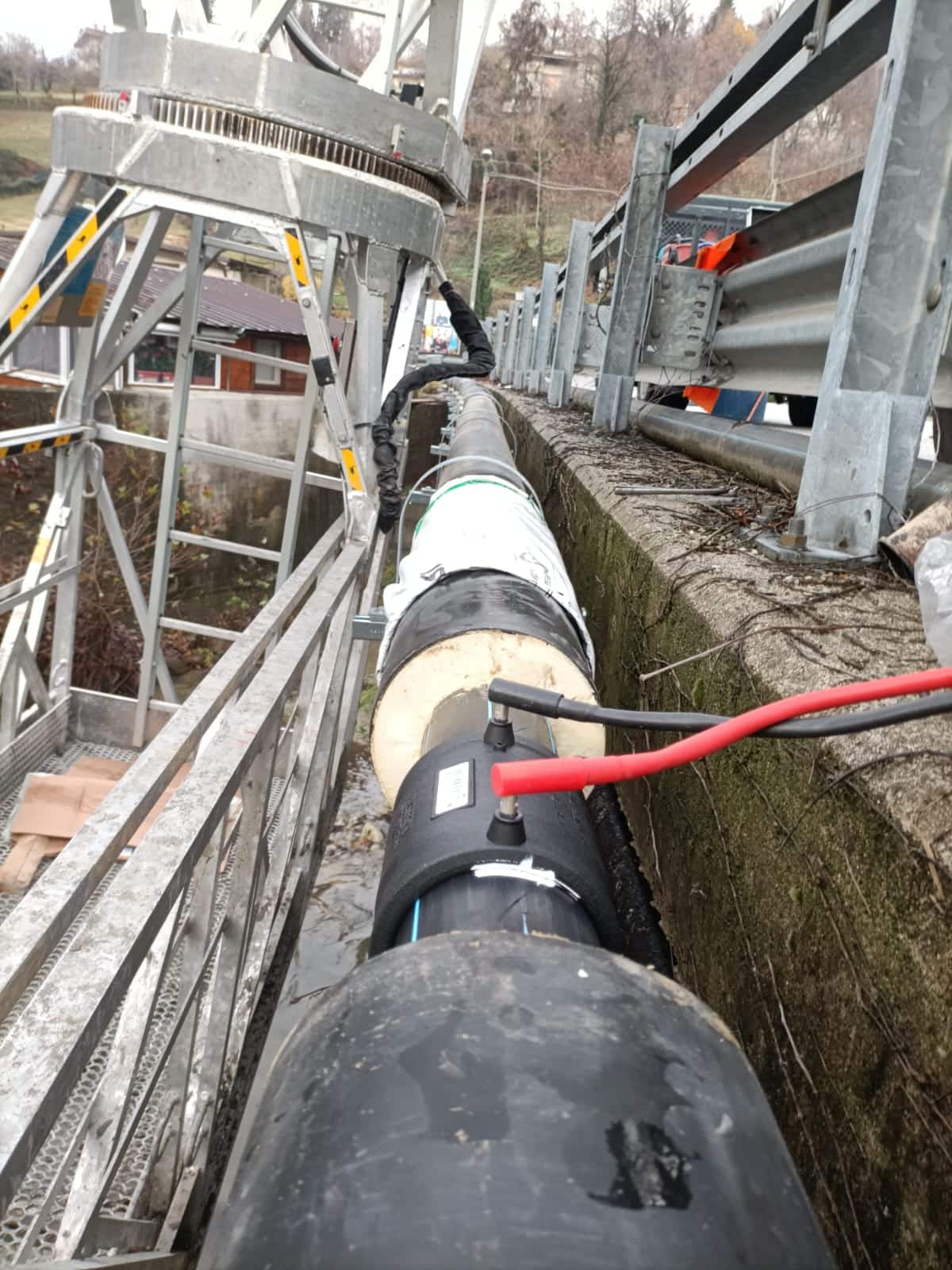 La tubazione lungo il ponte di una località sciistica è stata fissata alla parete tramite mensole CorSTRUT 41×41 lunghe 450 mm e rulli in poliammide da 200. I rulli in poliammide permetterano alla tubazione di dilatarsi e contrarsi senza vincoli e sono perfetti per tubazioni di materiale plastico.